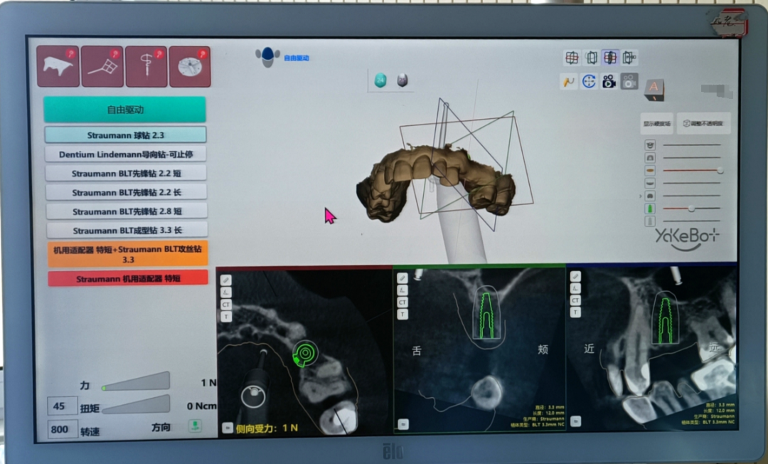 此次手术采用全球领先的自主式种植机器人系统,不仅展现了人工智能与医疗深度融合的未来趋势,更为辽南地区口腔种植技术树立了新的标杆,为广大患者带来更精准、更安全、更舒适的治疗体验。 接受手术的患者为左上第一、第二前磨牙缺失病例,术前CBCT显示骨高度13.0mm,骨宽度6.2mm,近远中间隙11.1mm,因缺牙间隙较小,拟植入一颗种植体。传统种植手术依赖医生经验,而机器人辅助技术则通过"脑""眼""手"三大智能模块,实现全程精准控制: